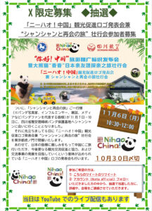 この度、2023年11月7日より「シャンシャンと再会の旅」ご一行様(※パンダ写真家、インフルエンサー、雑誌、メディアなどパンダファンを代表する皆様)が日本より派遣されることとなりました。出発に先立ちまして、11月6日に「ニーハオ!中国」観光促進ロゴ発表会兼シャンシャンと再会の旅壮行会が開催される運びとなりました。