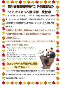 お手紙や、寄せ書き、似顔絵など、みなさんのシャンシャンへの贈り物があれば、住所宛に11月1日までにご郵送ください。