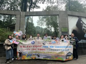 中国ジャイアントパンダ保護研究センター雅安碧峰峡基地前での集合写真
