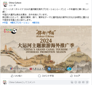 中外文化交流センターが、中国の大運河沿岸地域の8つの省と市の文化と旅游庁・局が連携して共同でプロモーションする”你好(ニーハオ)!中国“大運河観光海外プロモーションシーズン2024に基づいて、中国駐東京観光代表処のX(旧Twitter)、Instagram、YouTube、TikTok等の公式アカウントを通して、プロモーション活動を行いました。