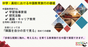 本セミナーでは、中国の基本情報に加え、教育制度の概要、教育旅行におけるポイントを紹介するとともに、北京、上海、西安を中心とした主要観光地を取り上げました。あわせて、中国における教育旅行コンテンツの多様性について説明し、北海道内の学校、自治体、旅行会社をはじめとする関係者の皆様に向けて、中国教育旅行の魅力を発信しました。