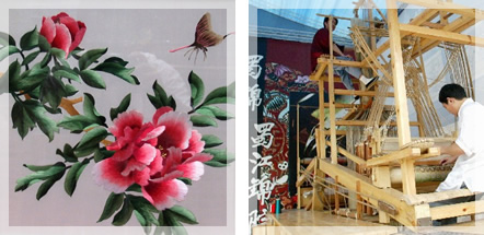 シルク産業は刺繍と錦織物工芸を大きく発展させた。蘇州刺繍、湖南刺繍、広東刺繍と四川刺繍は中国の四大刺繍と称されている。有名な錦織物には南京の雲錦、蘇州の宋錦、四川の蜀錦がある。一部の少数民族、チワン族、リー族、トン族、トウチャ族では、民族色の濃い錦織物を作っている。